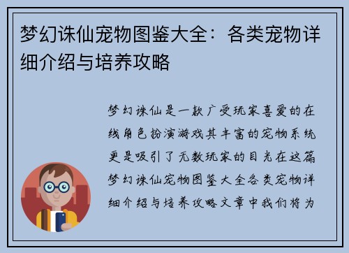 梦幻诛仙宠物图鉴大全:各类宠物详细介绍与培养攻略